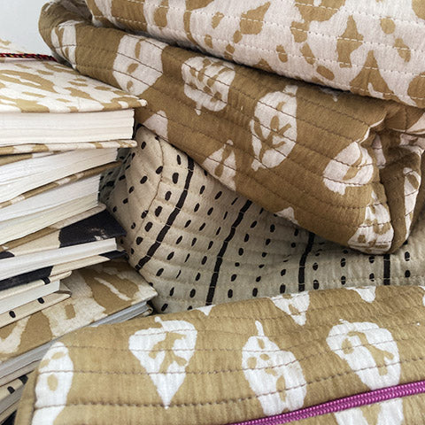 The shades of Indigo may vary as small batches of fabric soak in natural Indigo dye baths exploring chemistry. Waves of Indigo fabric lay spread under the brilliant sun for drying before its washed to release the mud resist. It is imperfect, beautiful and almost like poetry. It takes patience, care and a reliance on nature.